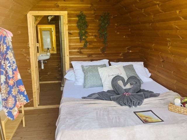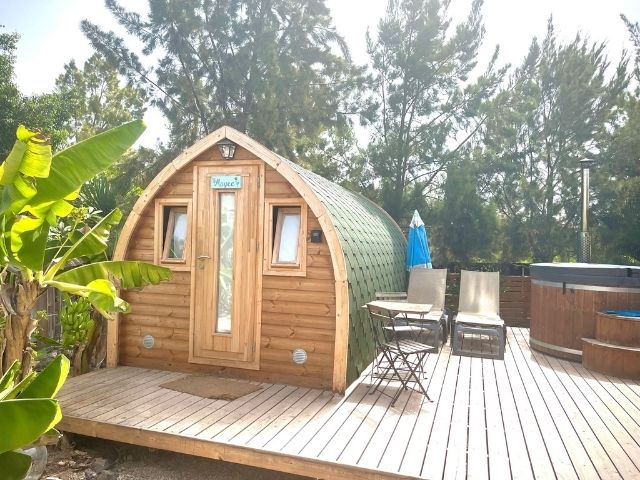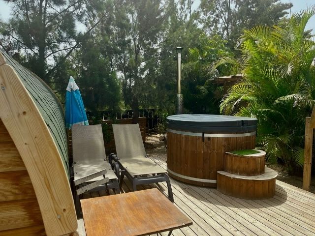 El complejo ofrece amplias zonas comunes, piscina, cocina completamente equipada, acogedores rincones para descansar y espacios para practicar yoga. También encontrarás juegos de mesa y mesa de ping pong para momentos de diversión. Si buscas una experiencia diferente y fuera de lo común, este alojamiento es la opción ideal